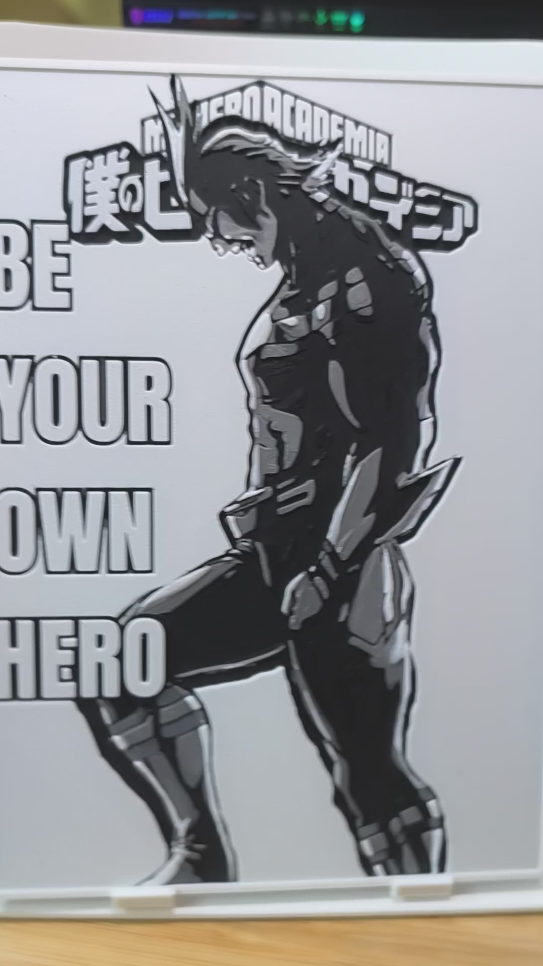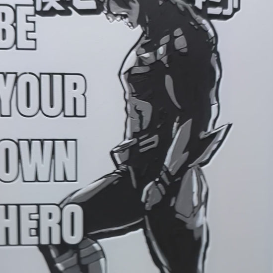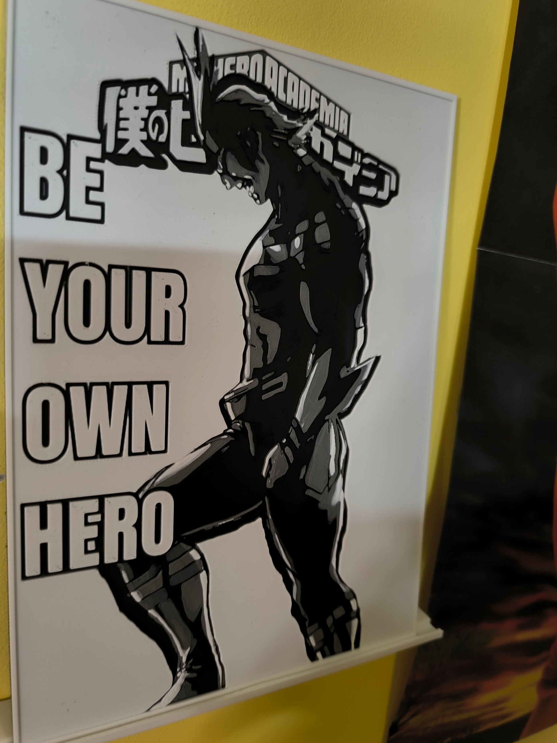 Sublimez votre espace avec cette magnifique plaque décorative mettant en scène All Might, le Symbole de la Paix de My Hero Academia, avec le message inspirant "Be Your Own Hero". Design exclusif 3DNoSekai en noir et blanc sur fond blanc avec effet relief.
