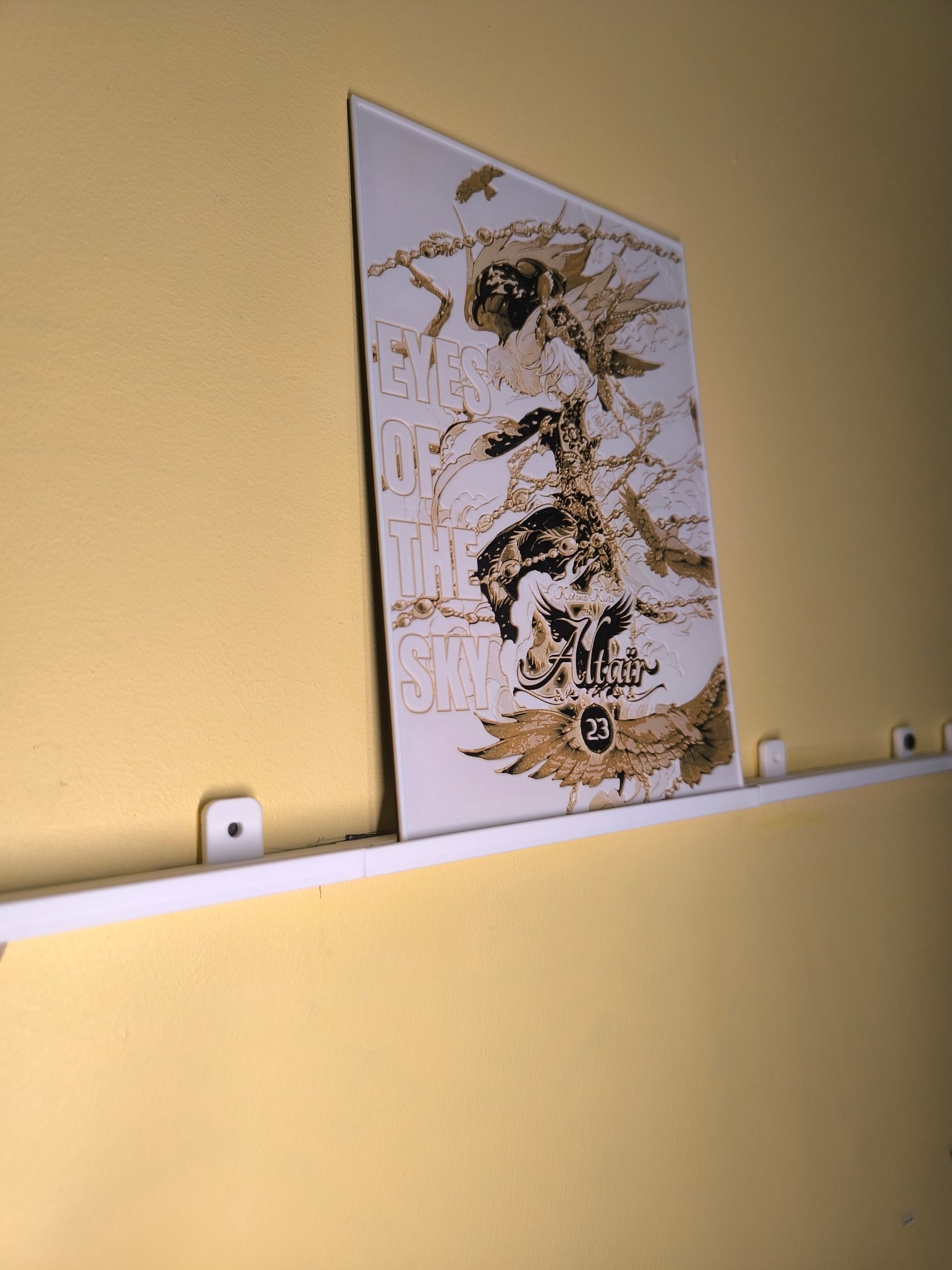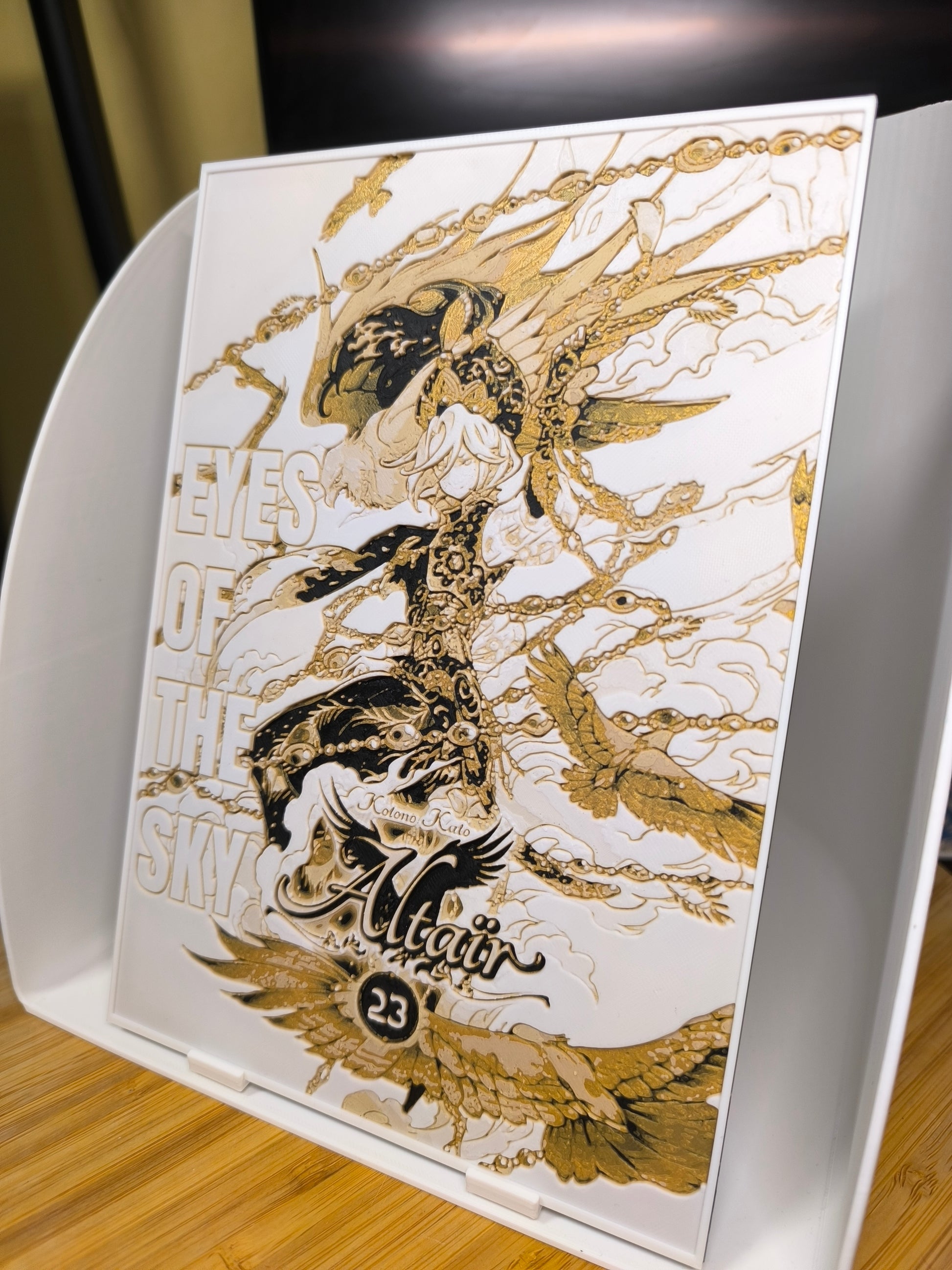 Sublimez votre espace avec cette magnifique plaque décorative mettant en scène Mahmut et son fidèle faucon Altair, inspirée de la cover 23 du manga Altair, avec le texte emblématique "Eyes of the Sky". Design exclusif 3DNoSekai en doré, noir et blanc sur fond blanc avec effet relief.