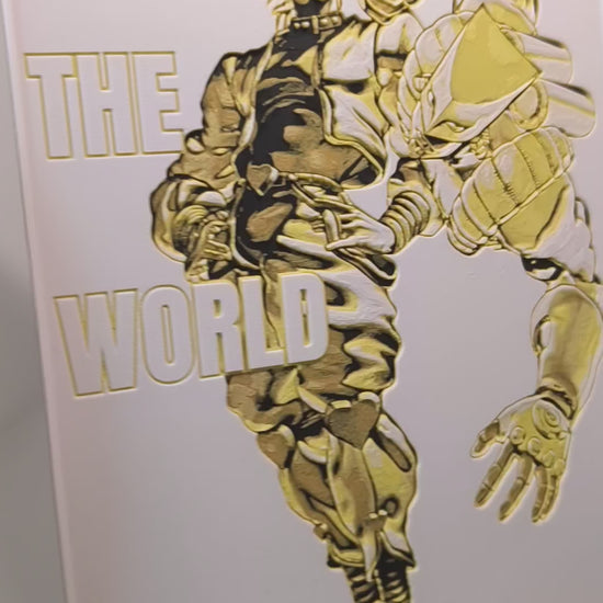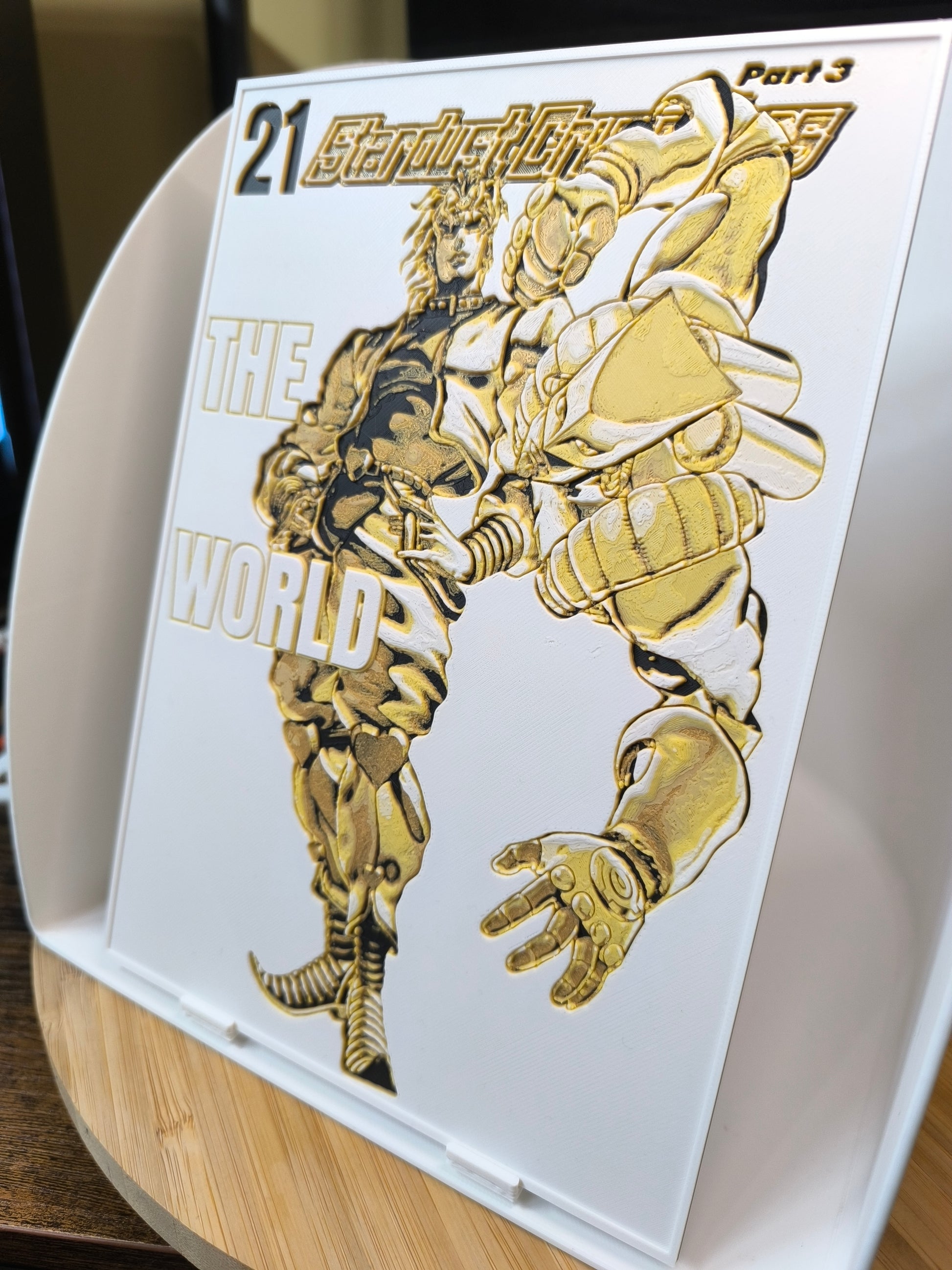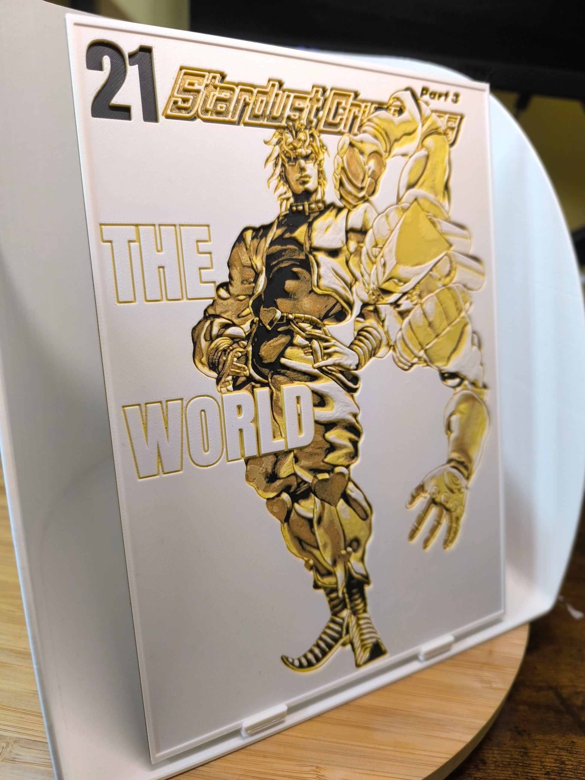 Sublimez votre espace avec cette magnifique plaque décorative mettant en scène DIO et son Stand légendaire The World de JoJo's Bizarre Adventure Part 3: Stardust Crusaders, avec le texte emblématique "21 Stardust Crusaders - The World". Design exclusif 3DNoSekai en doré et noir sur fond blanc avec effet relief.