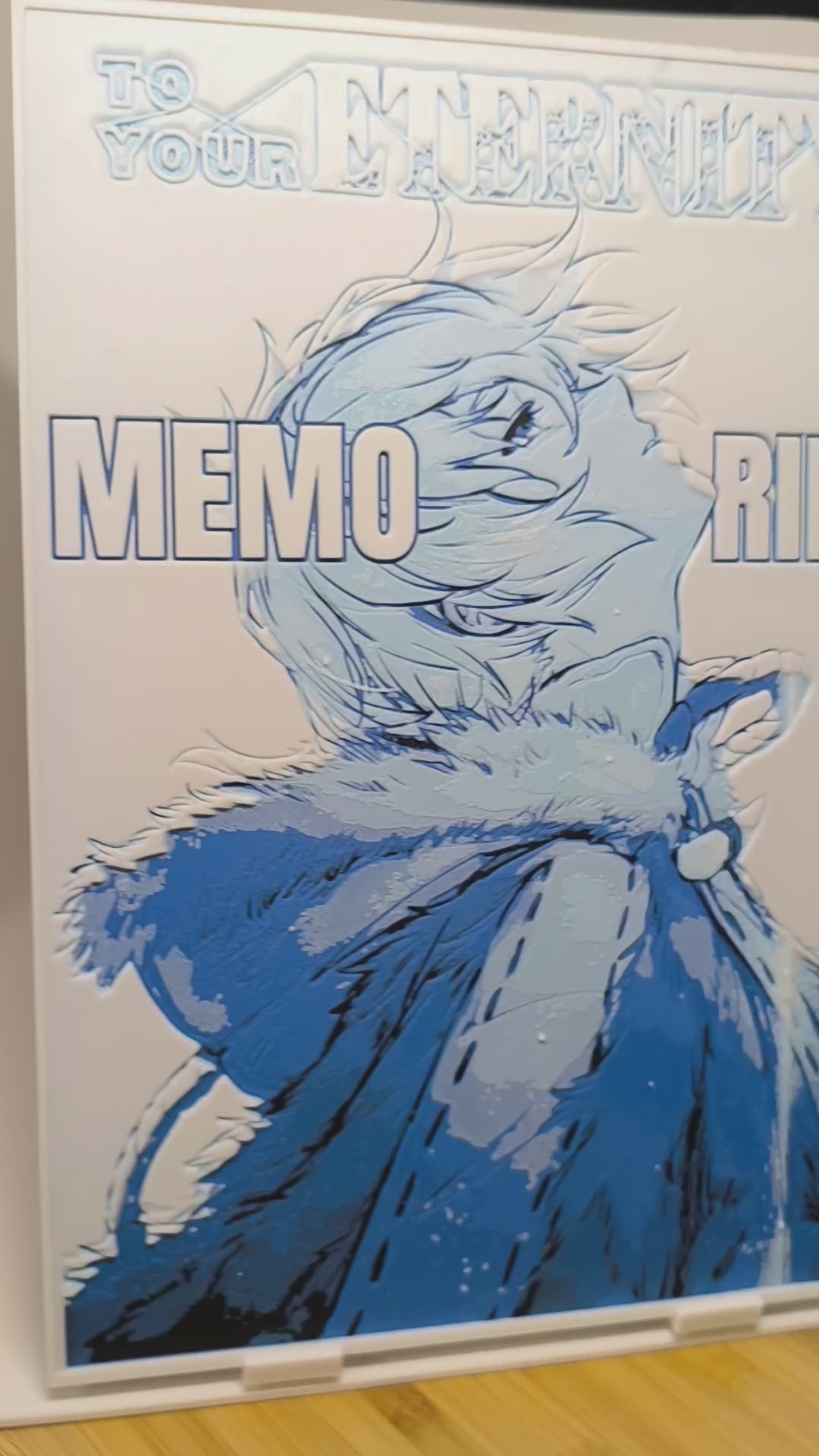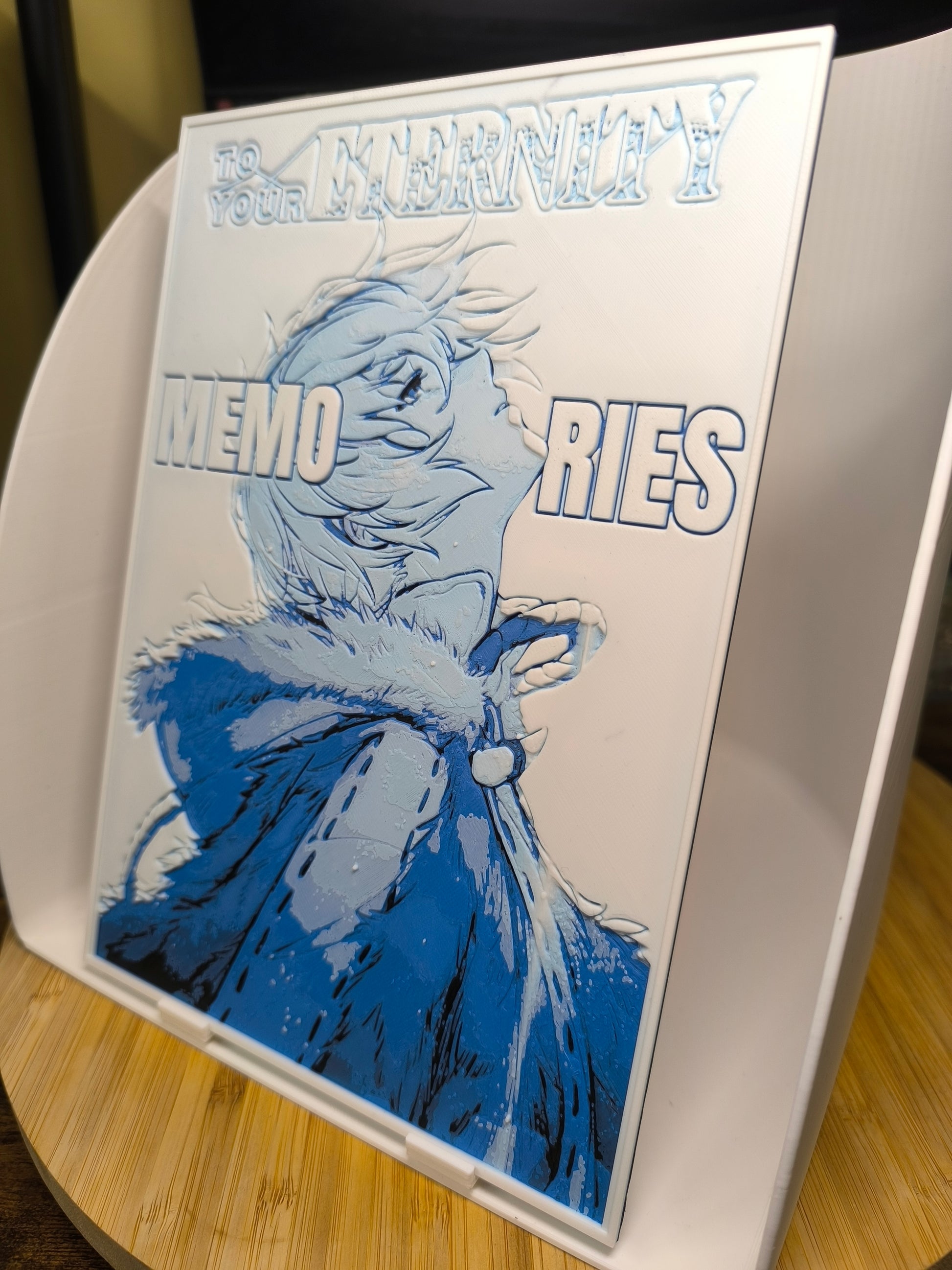 Sublimez votre espace avec cette magnifique plaque décorative mettant en scène Fushi de To Your Eternity, avec le texte emblématique "To Your Eternity - Memories". Design exclusif 3DNoSekai en bleu et blanc sur fond blanc avec effet relief.