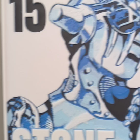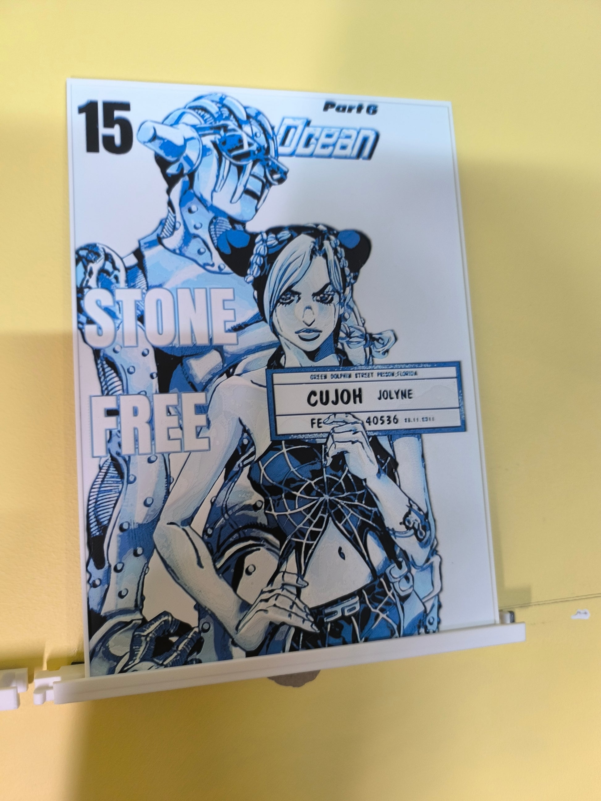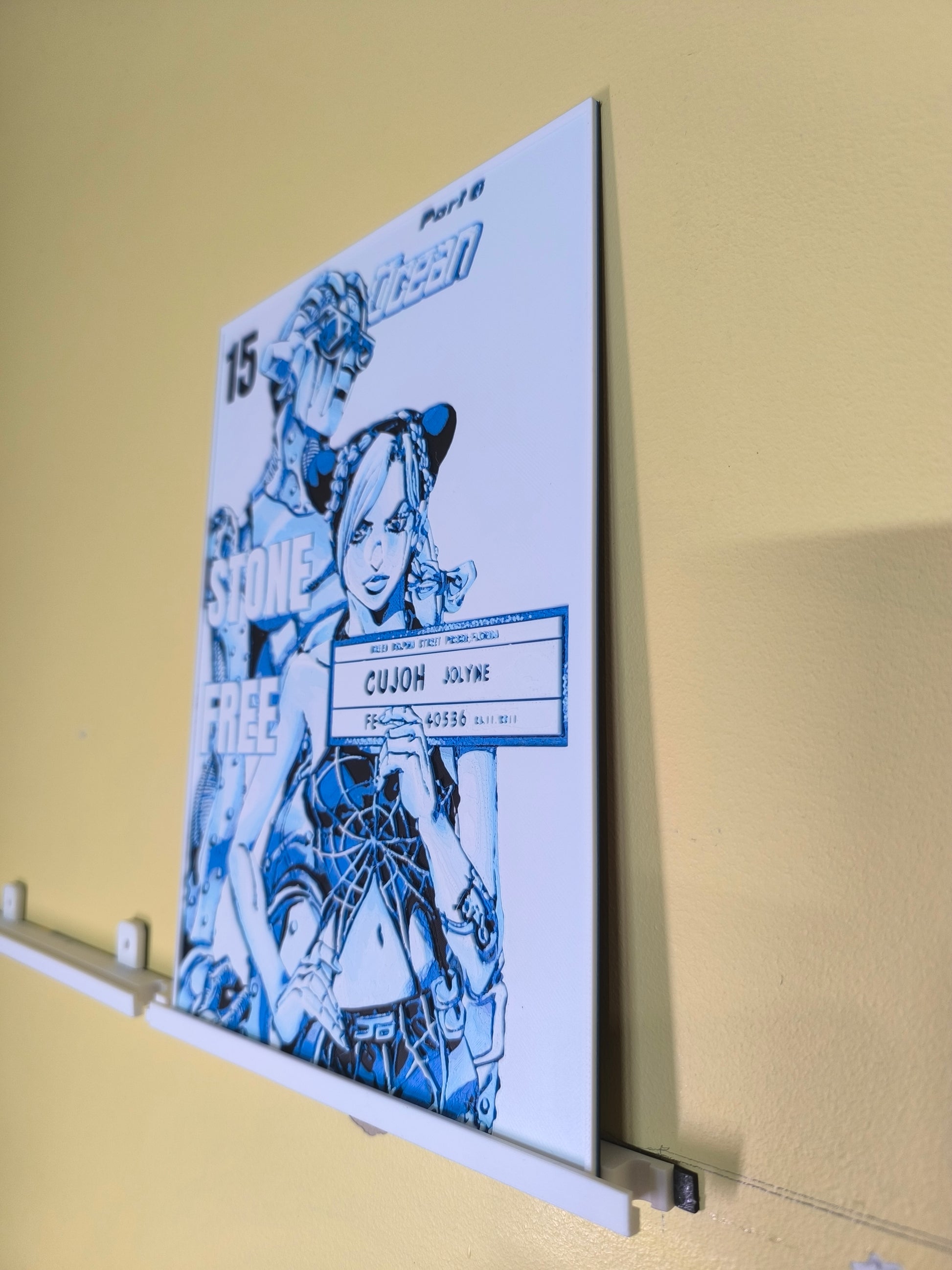 Sublimez votre espace avec cette magnifique plaque décorative mettant en scène Jolyne Cujoh et son Stand Stone Free de JoJo's Bizarre Adventure Part 6: Stone Ocean, avec le texte emblématique "15 Stone Ocean - Stone Free". Design exclusif 3DNoSekai en bleu et blanc sur fond blanc avec effet relief.