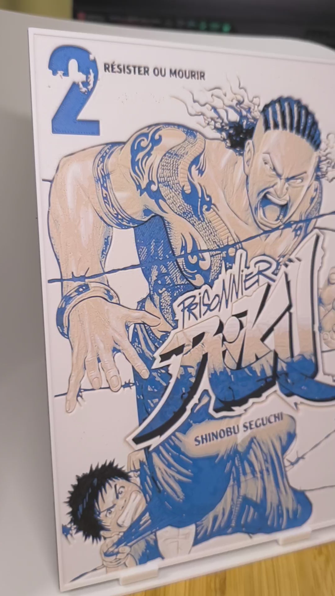 Sublimez votre espace avec cette magnifique plaque décorative mettant en scène la cover iconique du tome 2 de Prisoner Riku avec Shinobu Seguchi et Riku, avec le texte emblématique "2 Résister ou Mourir". Design exclusif 3DNoSekai en bleu et blanc sur fond blanc avec effet relief.