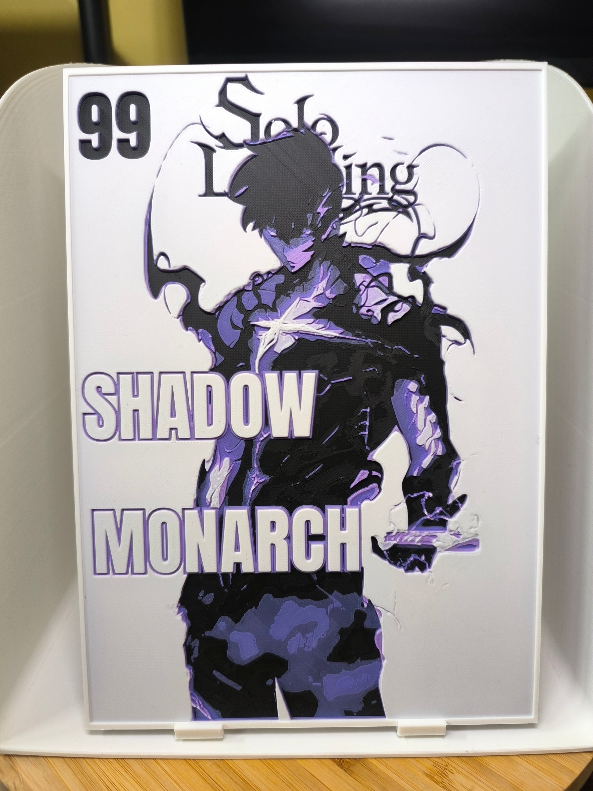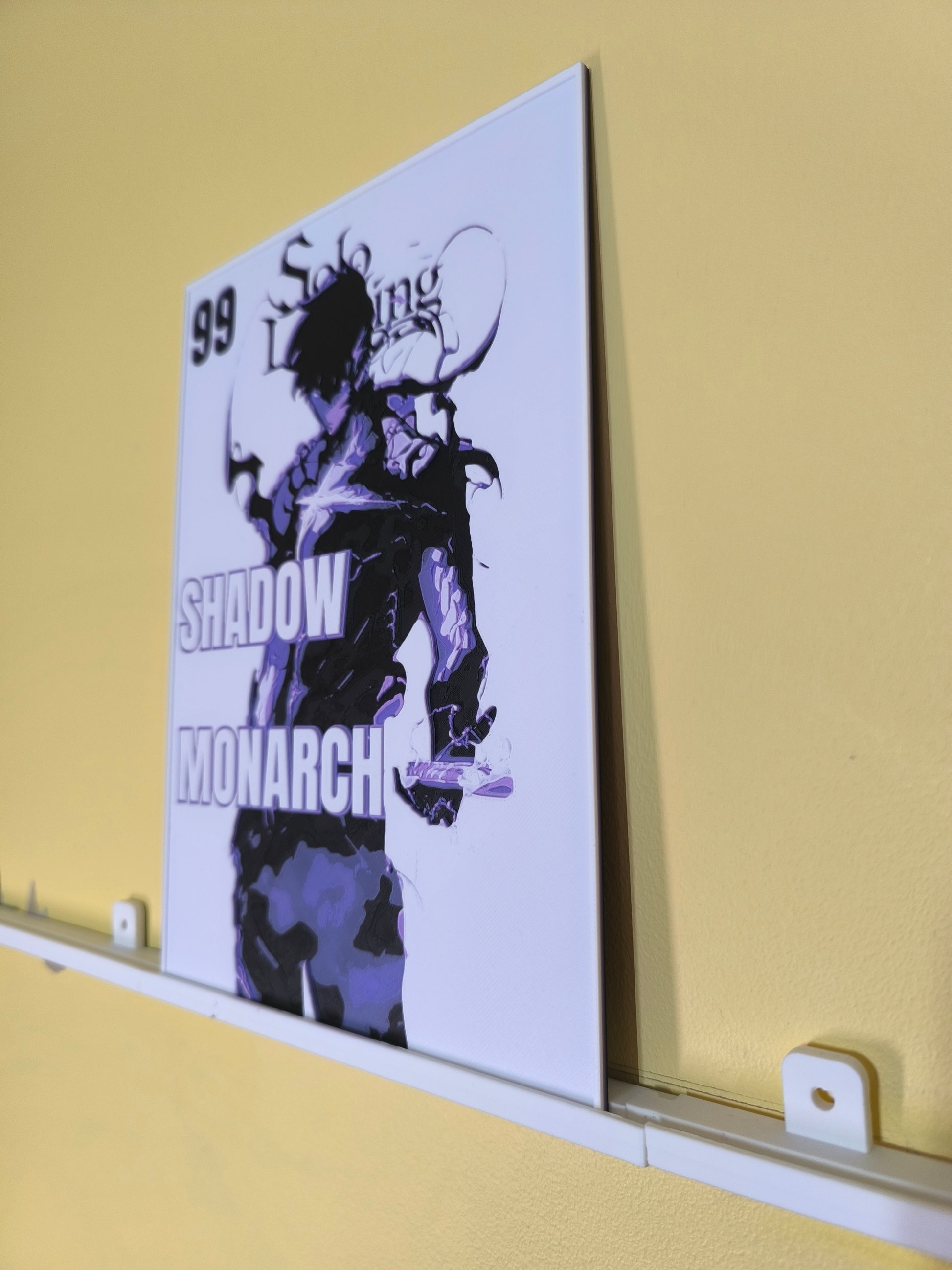 Sublimez votre espace avec cette magnifique plaque décorative mettant en scène Sung Jin-Woo en mode Shadow Monarch de Solo Leveling, avec le texte emblématique "99 Solo Leveling - Shadow Monarch". Design exclusif 3DNoSekai en violet et noir sur fond blanc avec effet relief.